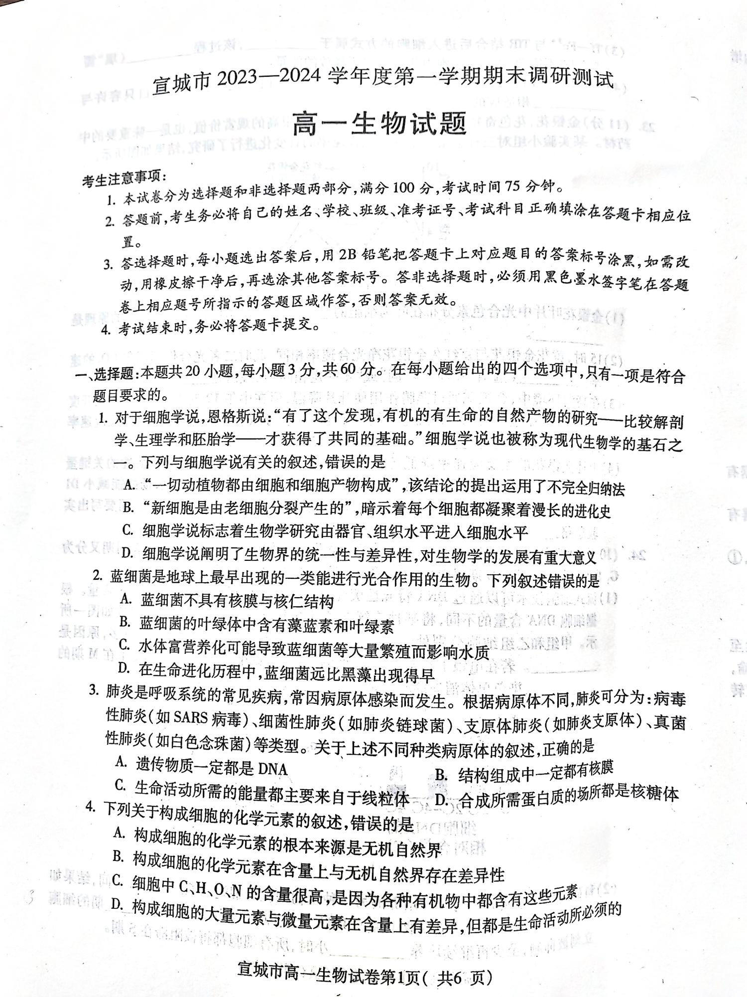 安徽省宣城市2023-2024学年高一上学期1月期末考试生物