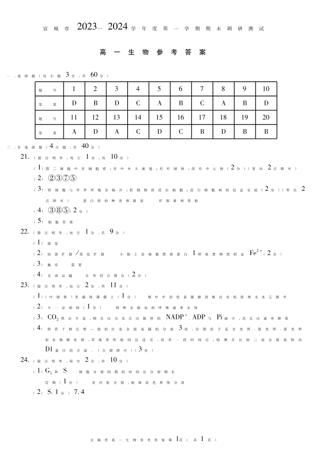 安徽省宣城市2023-2024学年高一上学期1月期末考试生物答案