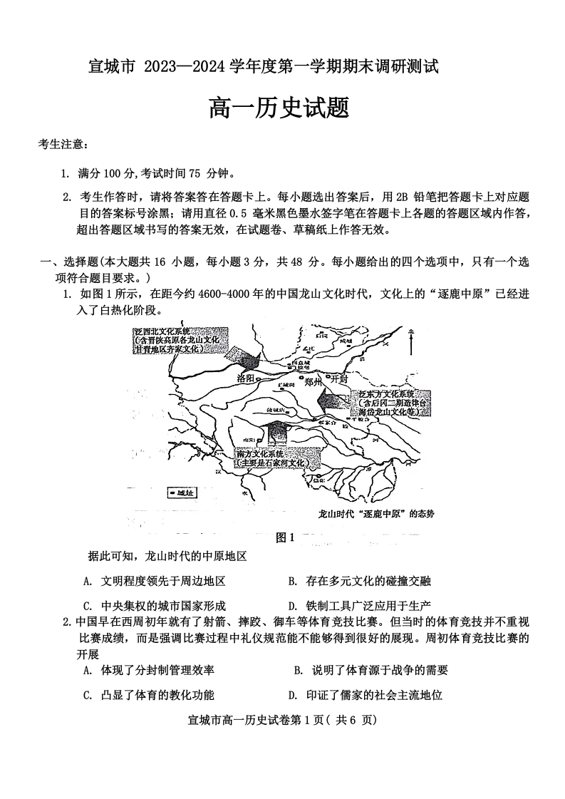 安徽省宣城市2023-2024学年高一上学期1月期末考试历史