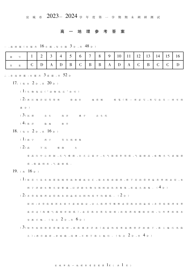 安徽省宣城市2023-2024学年高一上学期1月期末考试地理答案