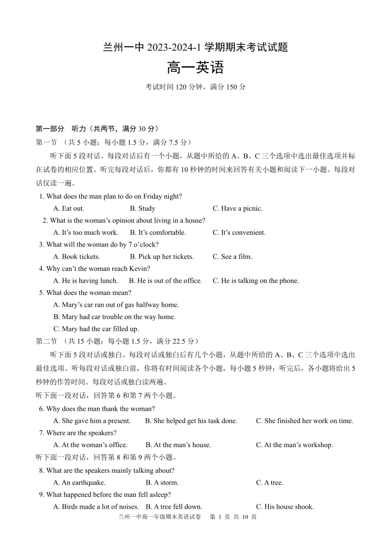 甘肃省兰州市城关区第一中学2023-2024学年高一上学期1月期末考试英语