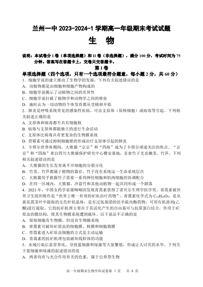 甘肃省兰州市城关区第一中学2023-2024学年高一上学期1月期末考试生物