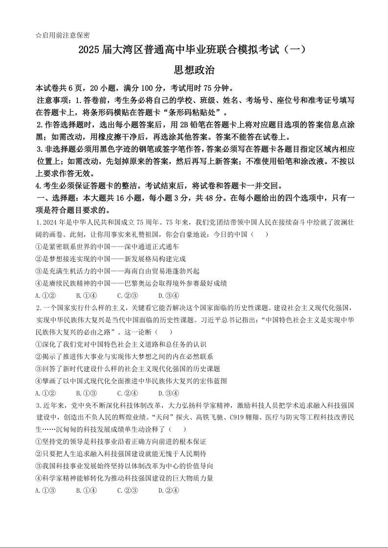 广东省大湾区普通高中2024-2025学年上学期毕业年级联合模拟政治