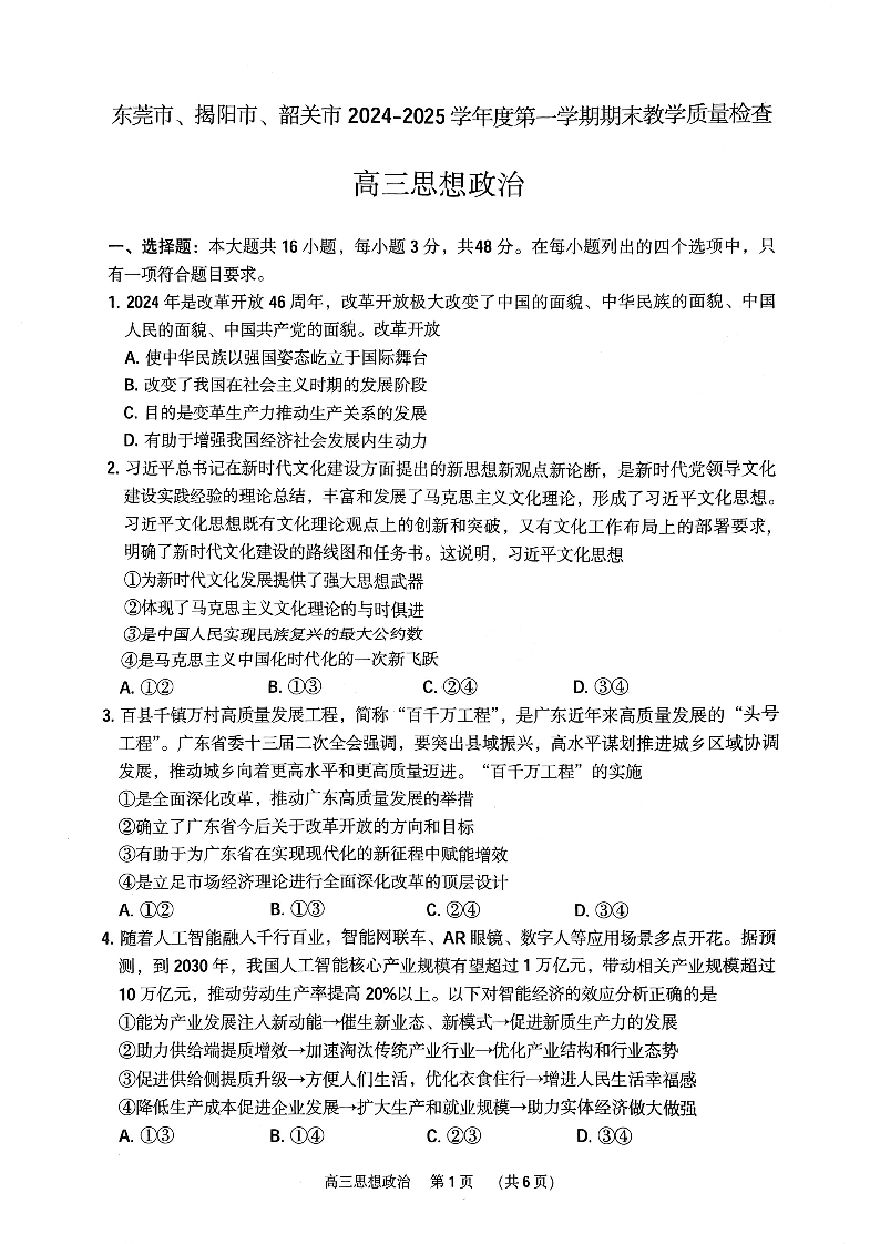广东省东莞市、揭阳市、韶关市2024-2025学年上学期高三期末考试政治+答案