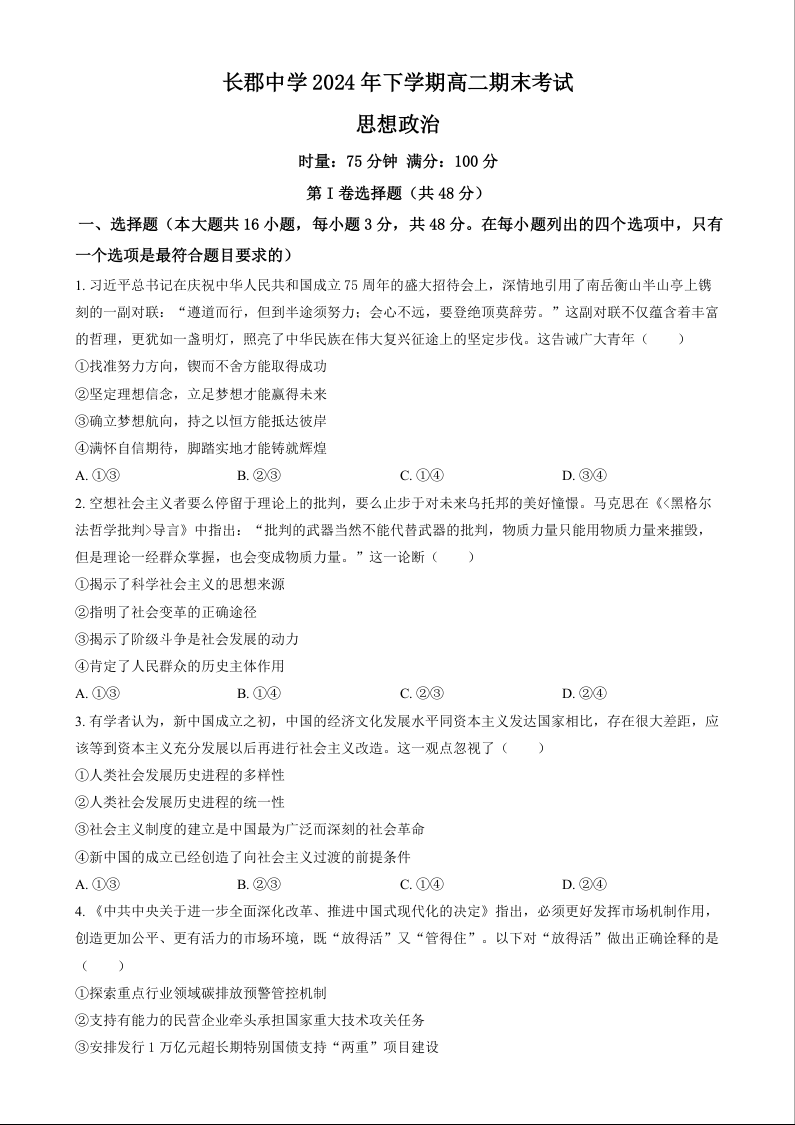 湖南省长沙市长郡中学2024-2025学年上学期高二期末考试政治(原卷版+精品解析版)