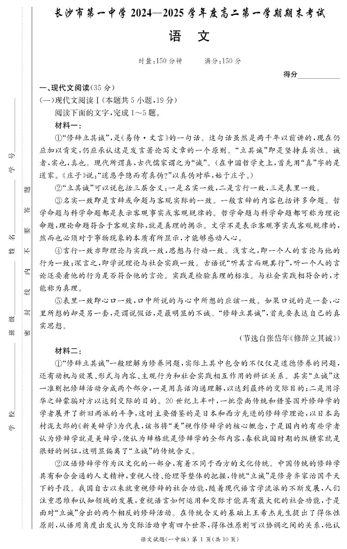 湖南省长沙市第一中学2024-2025学年上学期高二期末考试语文+答案