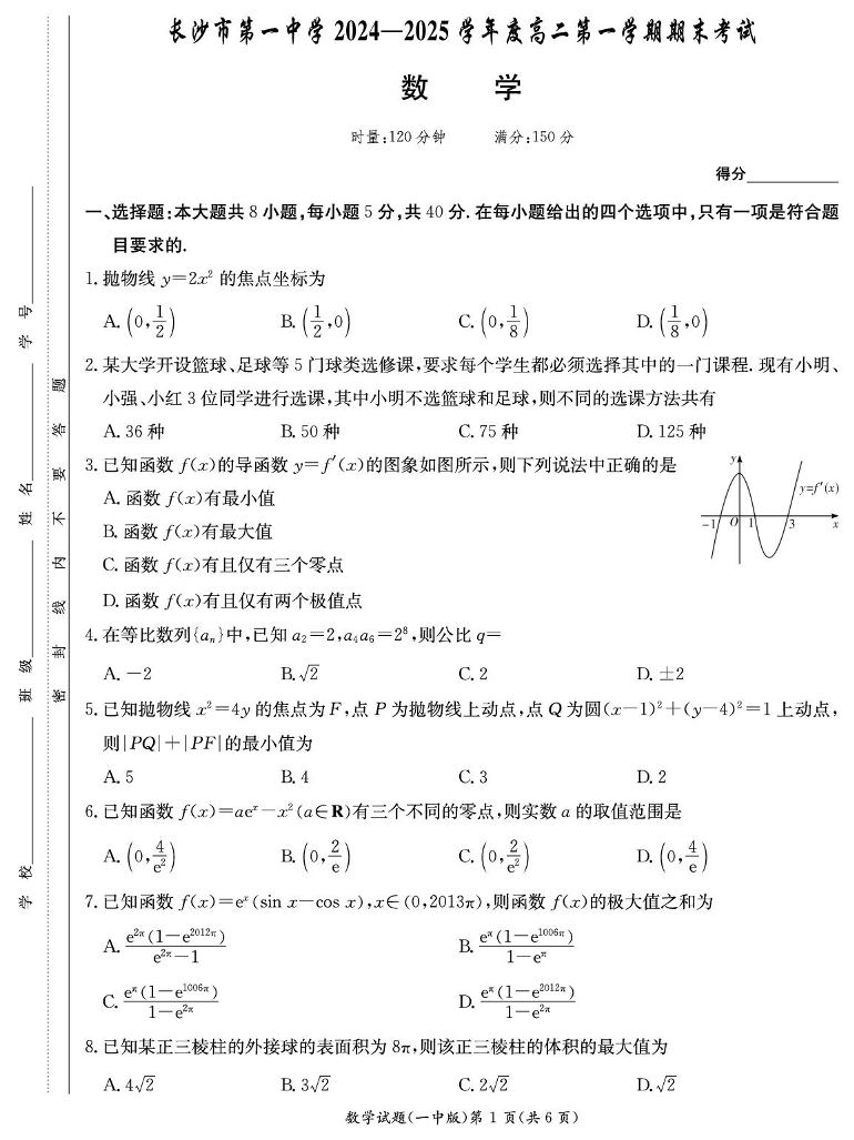 湖南省长沙市第一中学2024-2025学年上学期高二期末考试数学+答案
