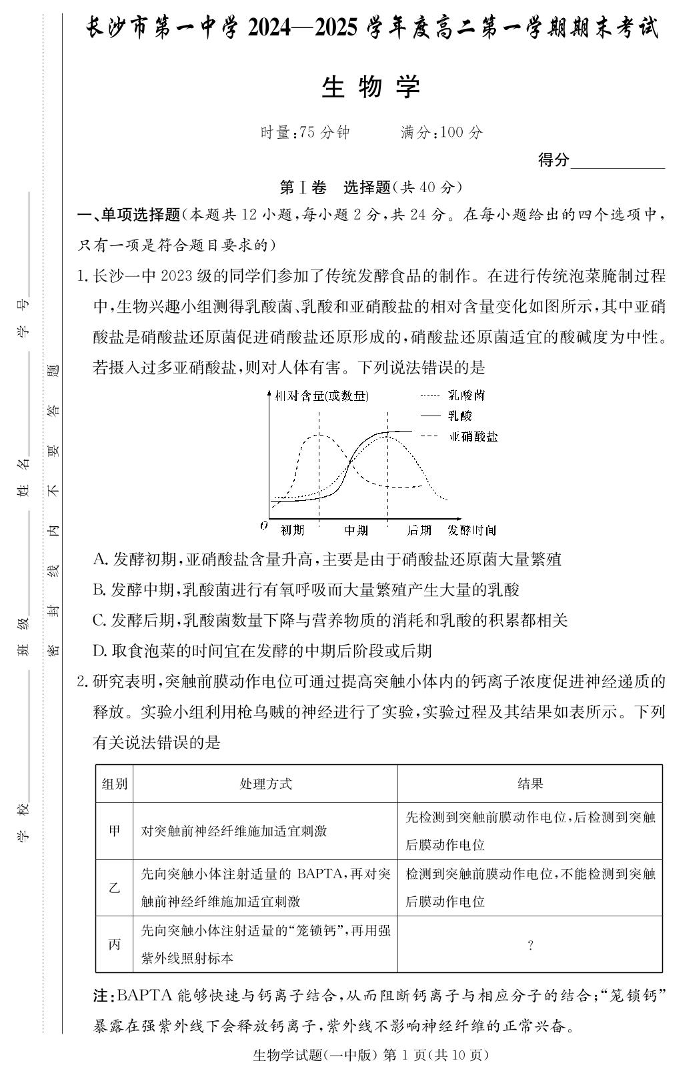 湖南省长沙市第一中学2024-2025学年上学期高二期末考试生物+答案