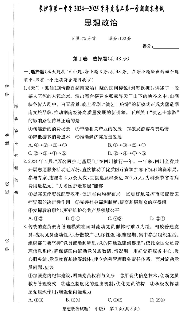 湖南省长沙市第一中学2024-2025学年上学期高二期末考试政治+答案
