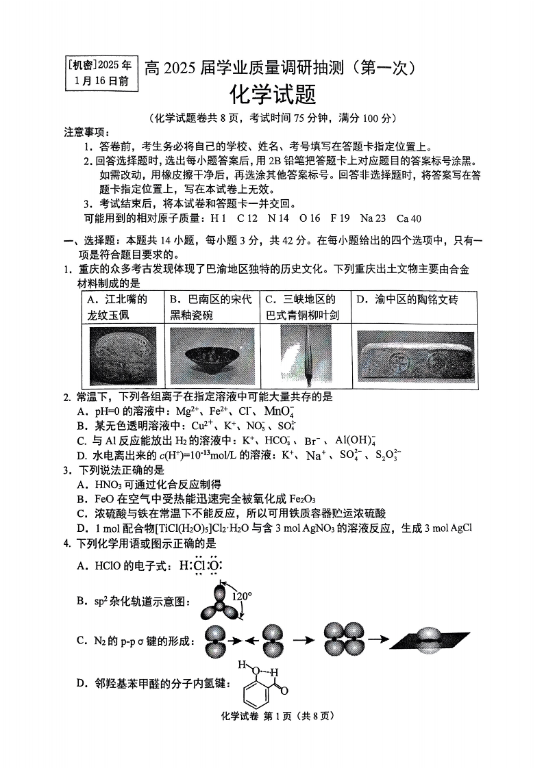 重庆市主城区2024-2025学年1月高三期末学业质量调研化学