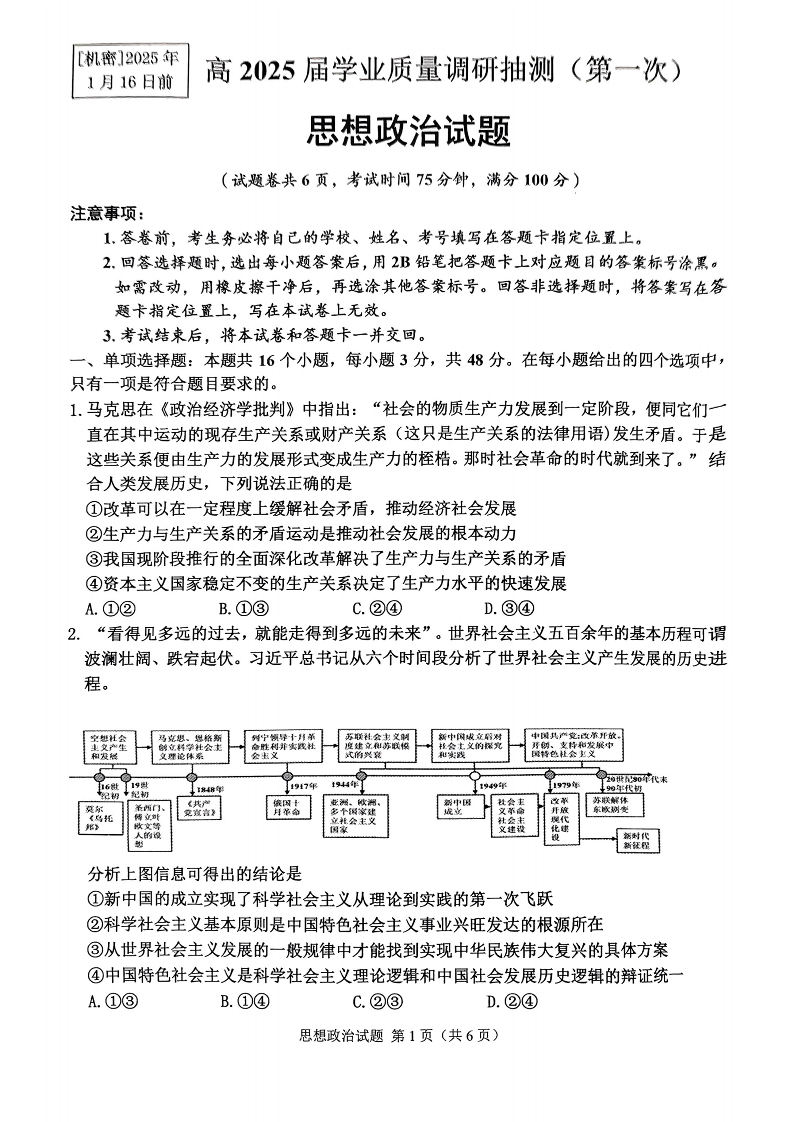 重庆市主城区2024-2025学年1月高三期末学业质量调研政治
