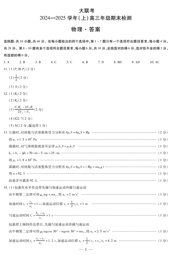 河南省区域高中2024-2025学年上学期1月高三期末考试物理答案