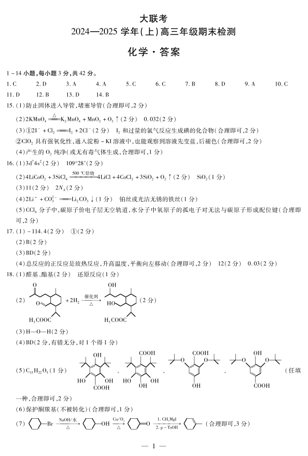 河南省区域高中2024-2025学年上学期1月高三期末考试化学答案