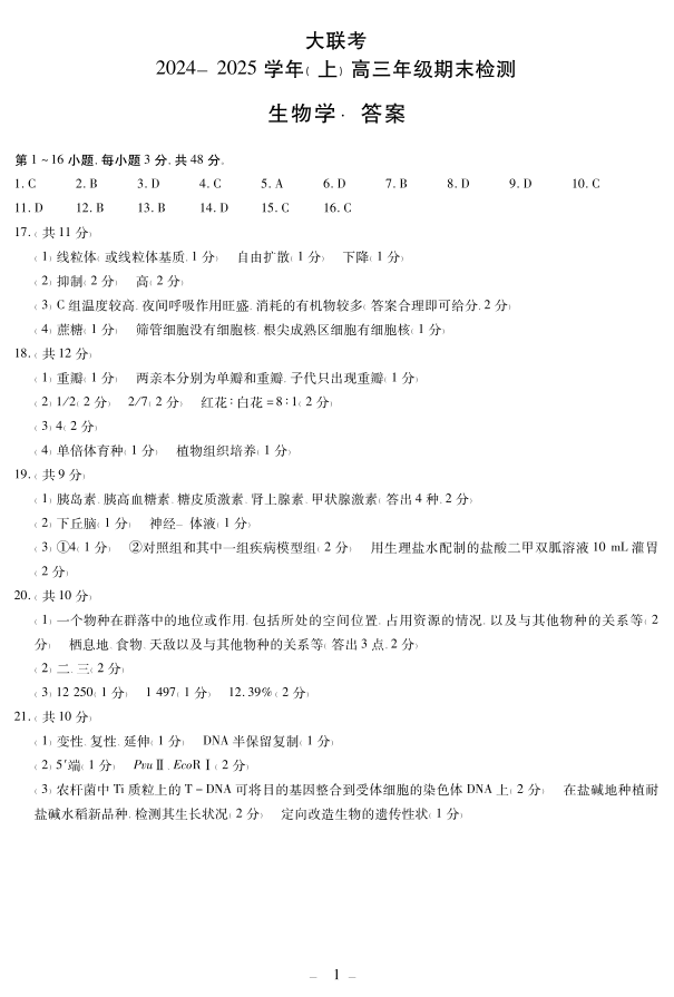 河南省区域高中2024-2025学年上学期1月高三期末考试生物答案