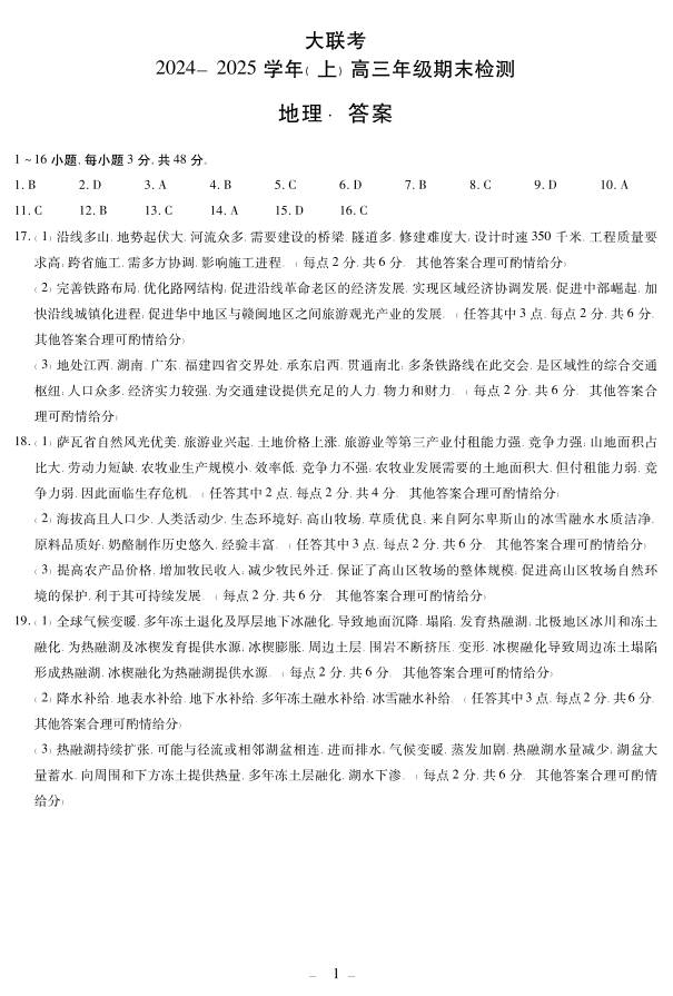 河南省区域高中2024-2025学年上学期1月高三期末考试地理答案