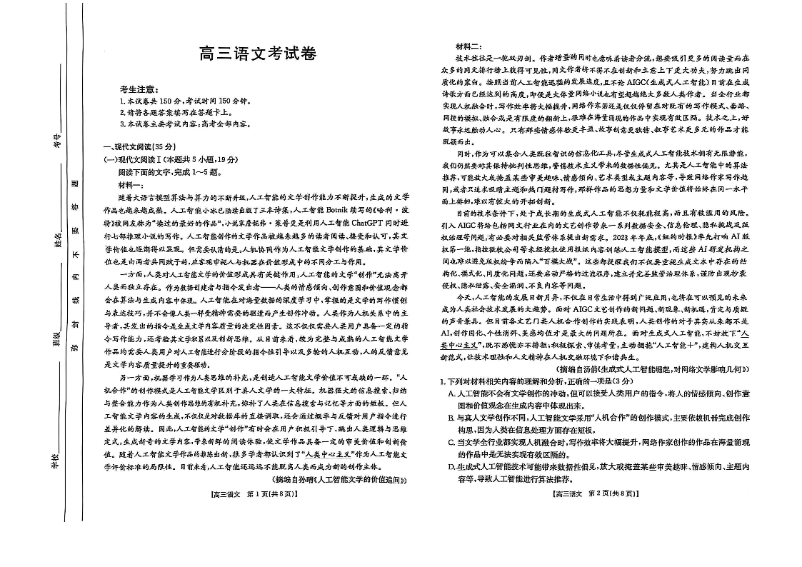 辽宁省部分学校2024-2025学年上学期1月高三期末联考语文