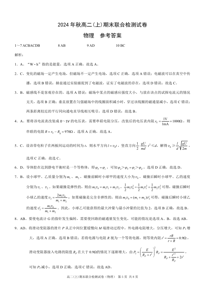 重庆市康德高中2024-2025学年上高二期末联合检测物理答案