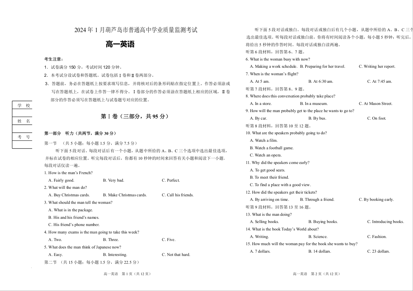 辽宁省葫芦岛市2023-2024学年高一上学期1月普通高中学业质量监测考试英语