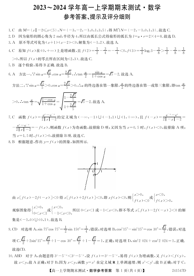 山西省2023-2024学年高一上学期1月期末联考数学答案