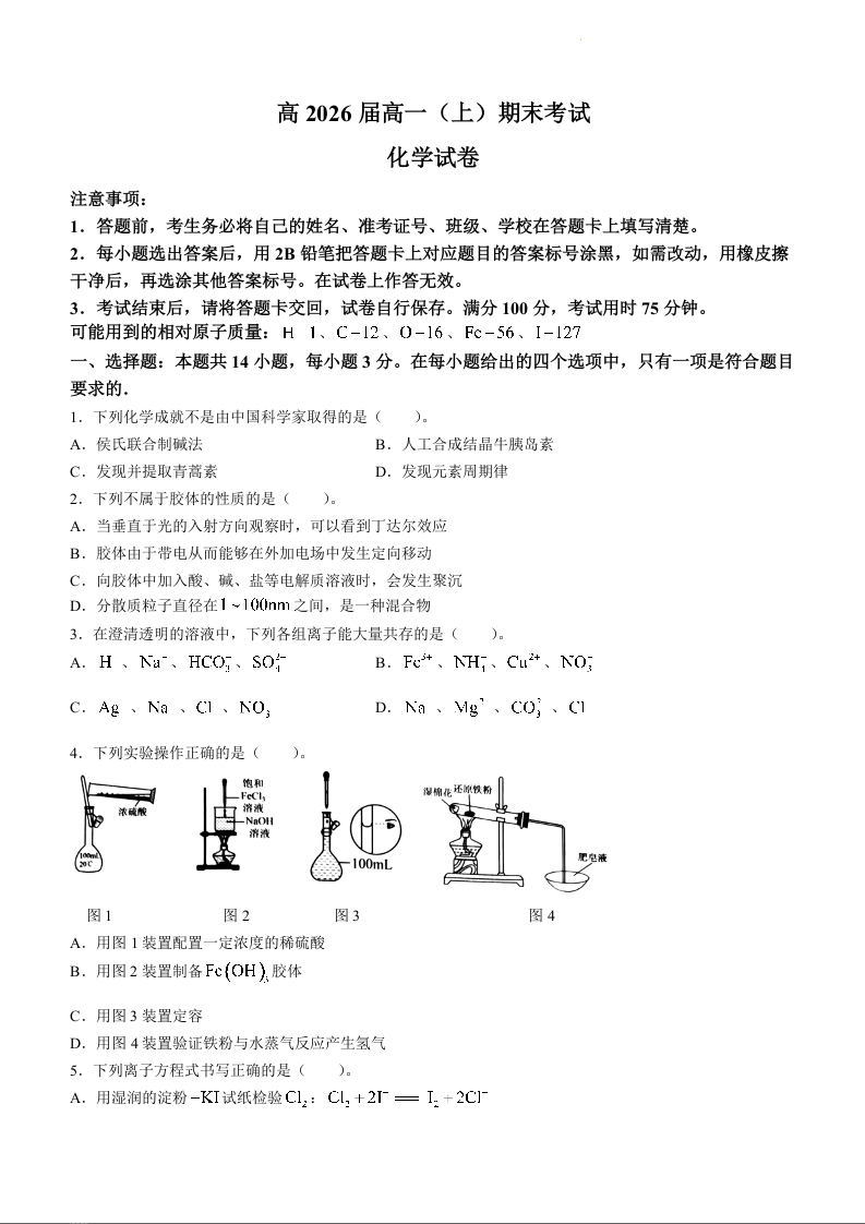 重庆市巴蜀中学2023-2024学年高一(上)期末考试化学