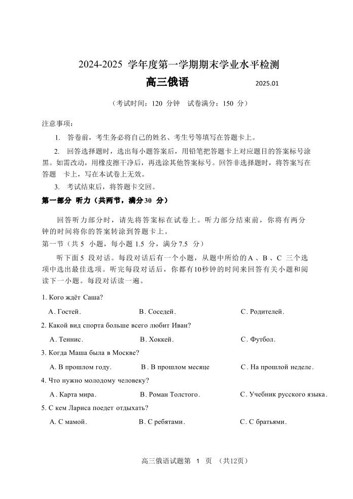 山东省青岛市2024-2025学年度第一学期高三期末学业水平检测俄语