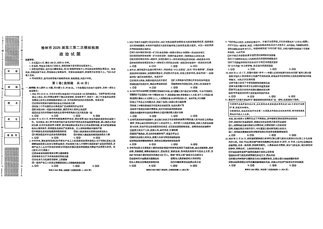 陕西省榆林市2025届高三1月第二次模拟检测(二模)政治+答案