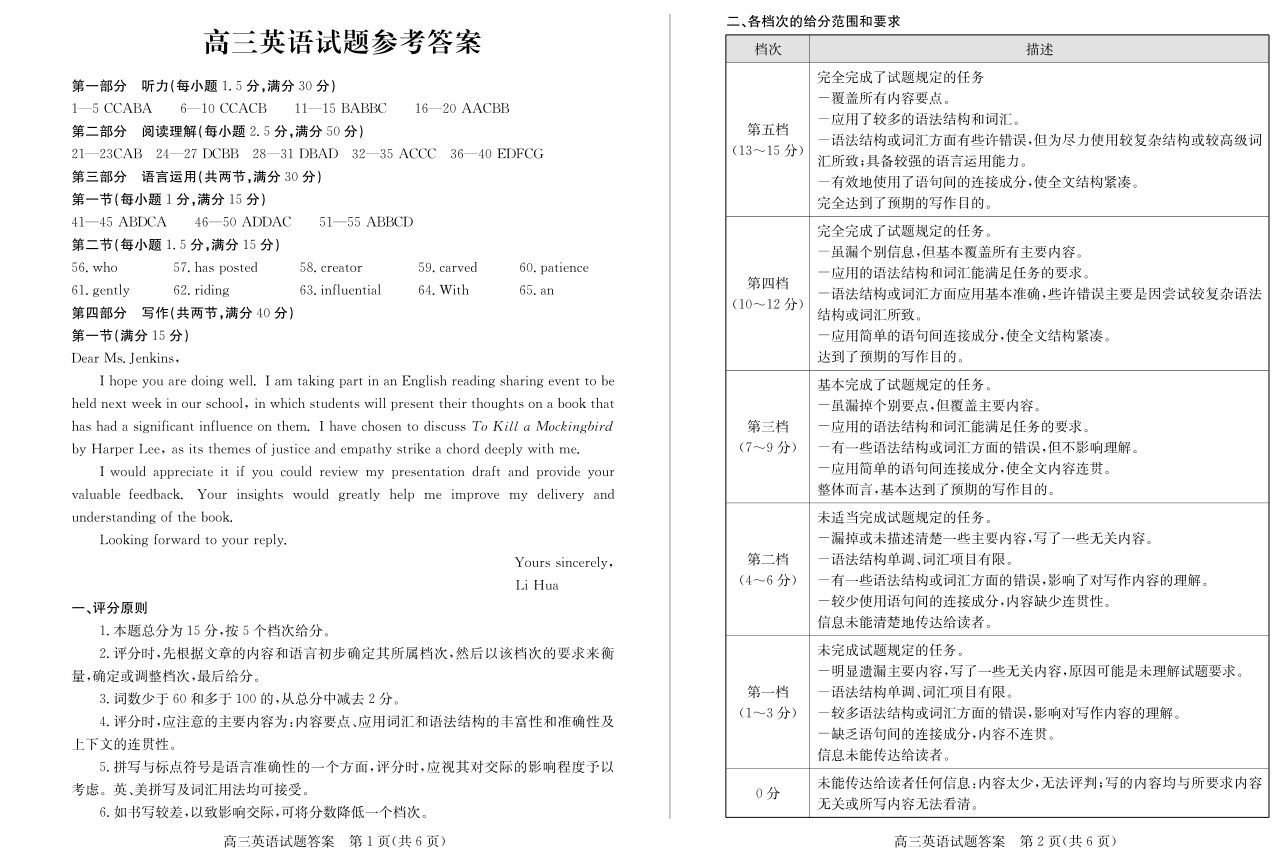 山东省德州市2024-2025学年上学期1月高三期末考试英语答案