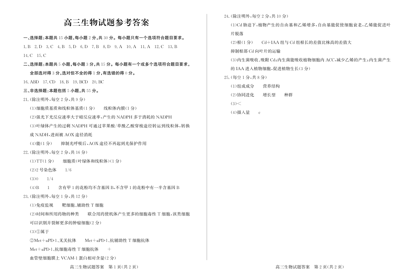 山东省德州市2024-2025学年上学期1月高三期末考试生物答案