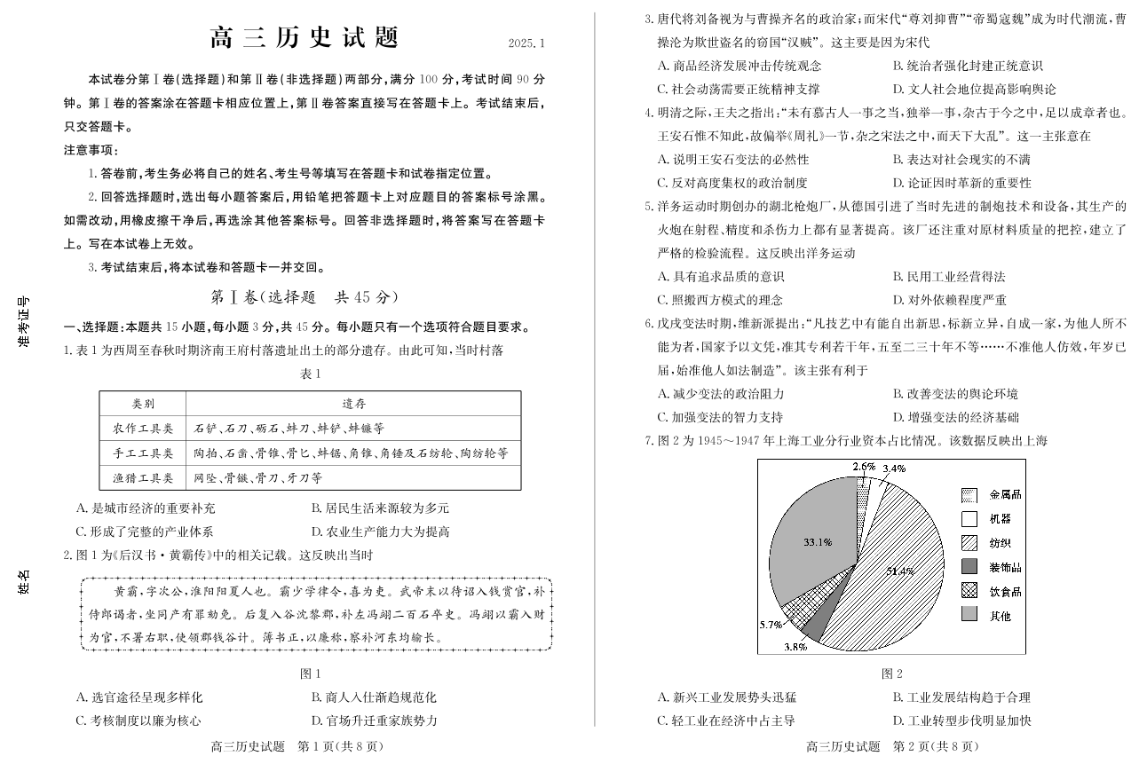 山东省德州市2024-2025学年上学期1月高三期末考试历史
