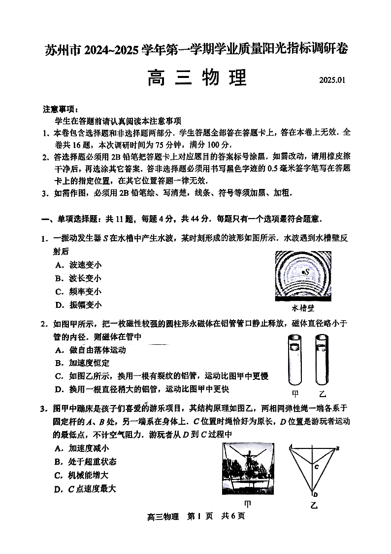 江苏省苏州市2024-2025学年上学期1月高三期末考试物理+答案