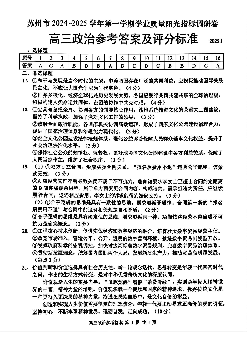 江苏省苏州市2024-2025学年上学期1月高三期末考试政治答案