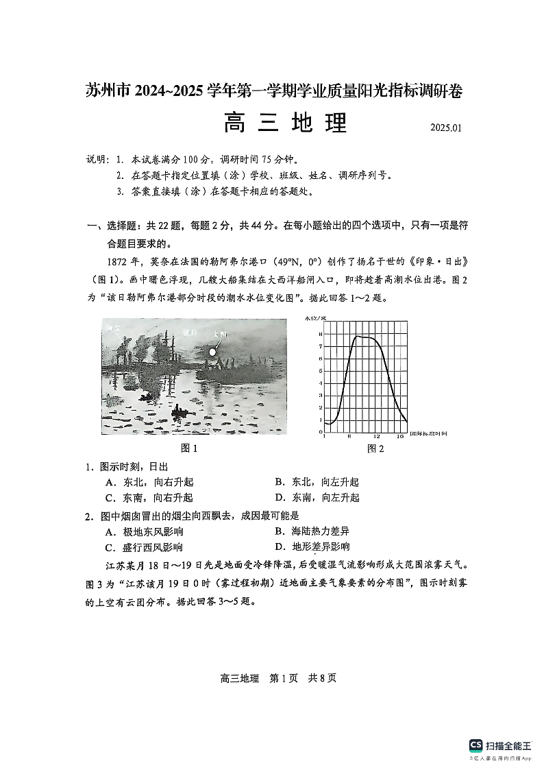 江苏省苏州市2024-2025学年上学期1月高三期末考试地理