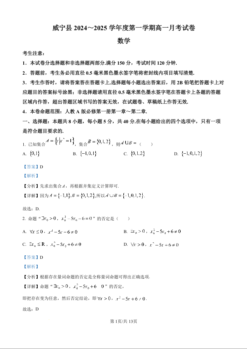 贵州省毕节市威宁县2024-2025学年高一上学期第一次月考数学(解析版)