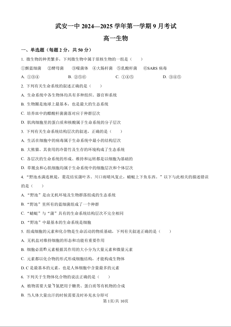 河北省邯郸市武安一中2024——2025学年第一学期9月考试生物(原卷版)