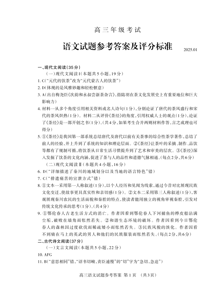 山东省泰安市2024-2025学年上学期1月高三期末考试语文答案