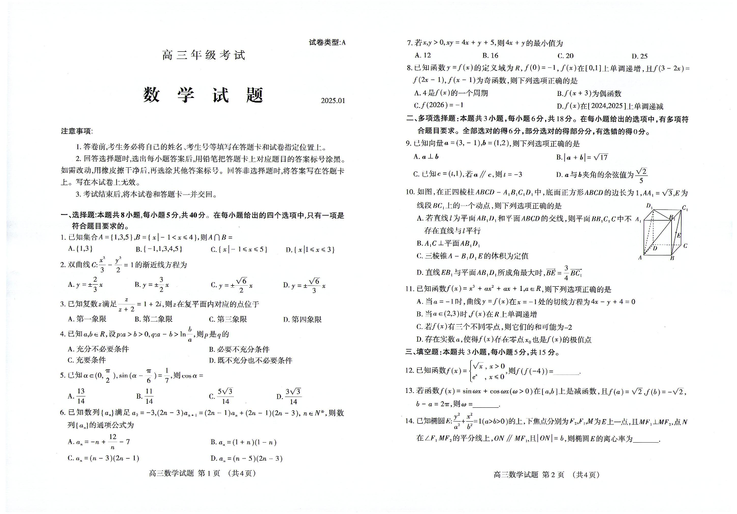山东省泰安市2024-2025学年上学期1月高三期末考试数学