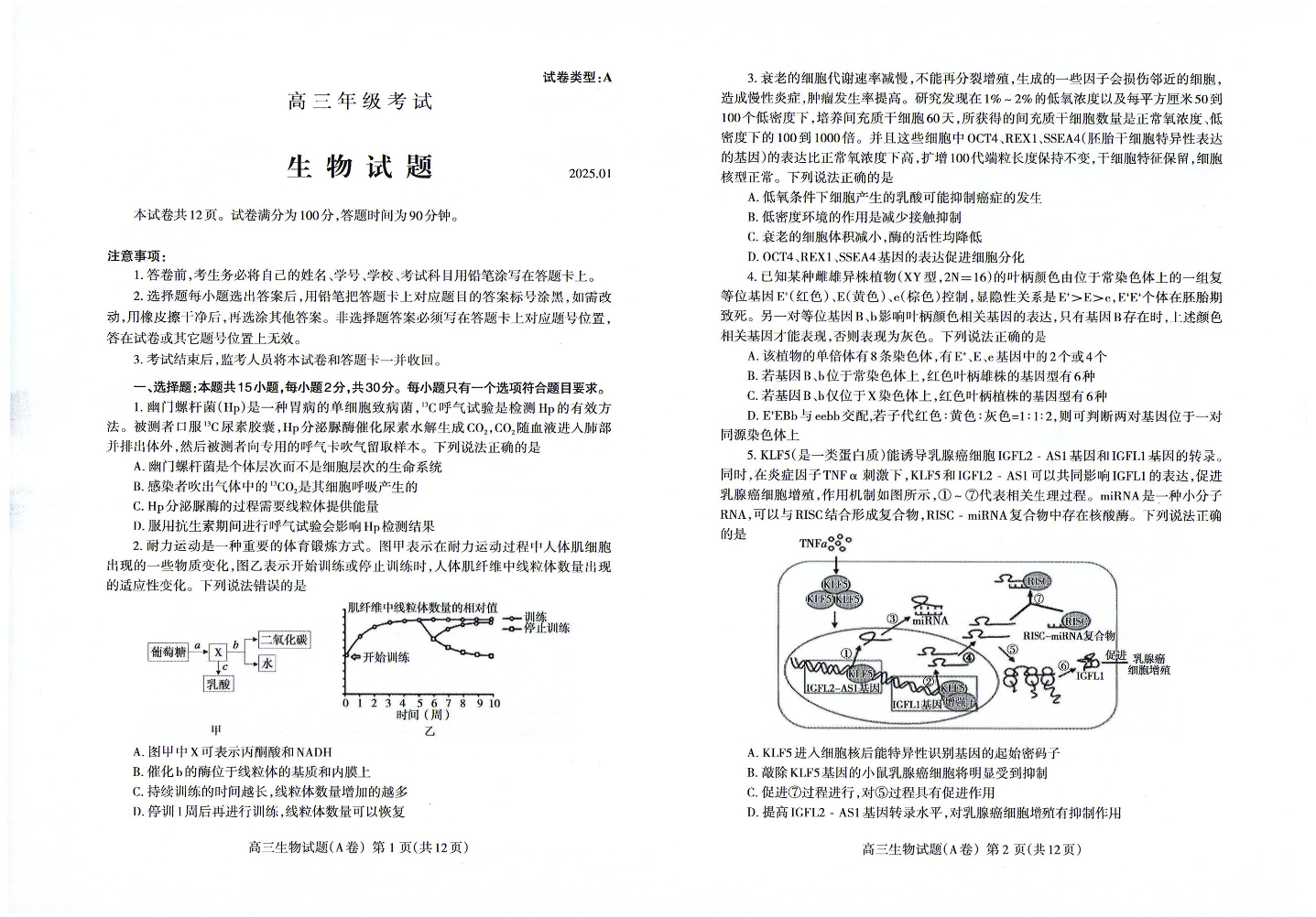 山东省泰安市2024-2025学年上学期1月高三期末考试生物