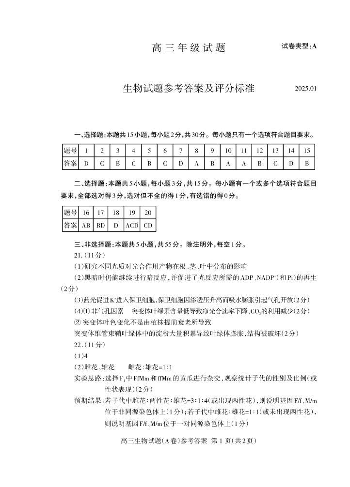 山东省泰安市2024-2025学年上学期1月高三期末考试生物答案