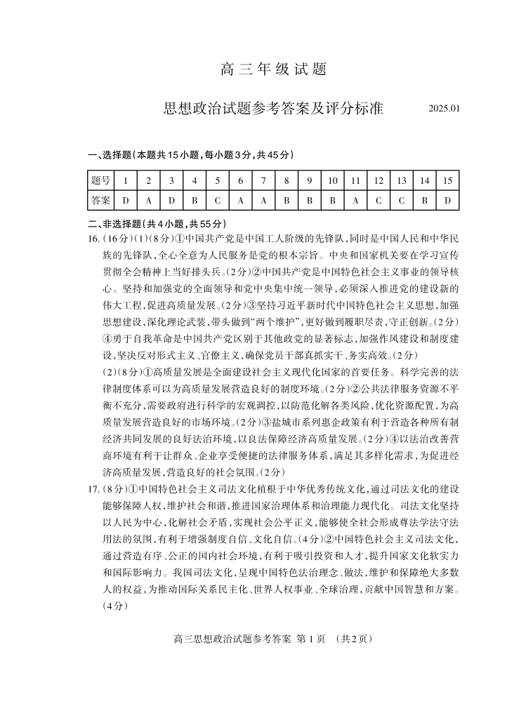 山东省泰安市2024-2025学年上学期1月高三期末考试政治答案