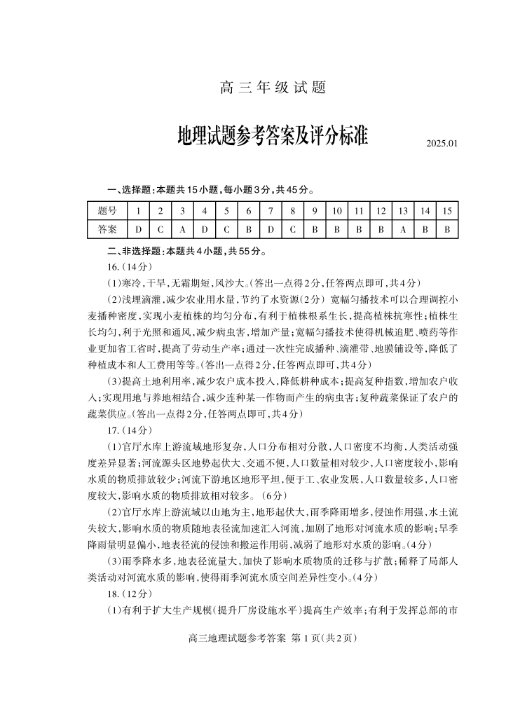 山东省泰安市2024-2025学年上学期1月高三期末考试地理答案