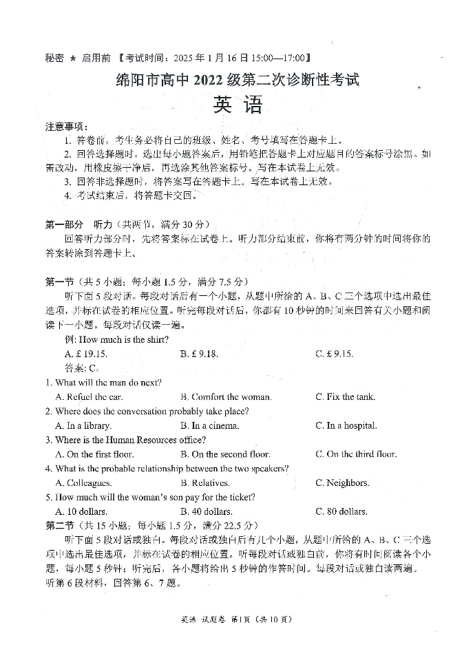 四川省绵阳市2024-2025学年上期高三第二次诊断性考试英语