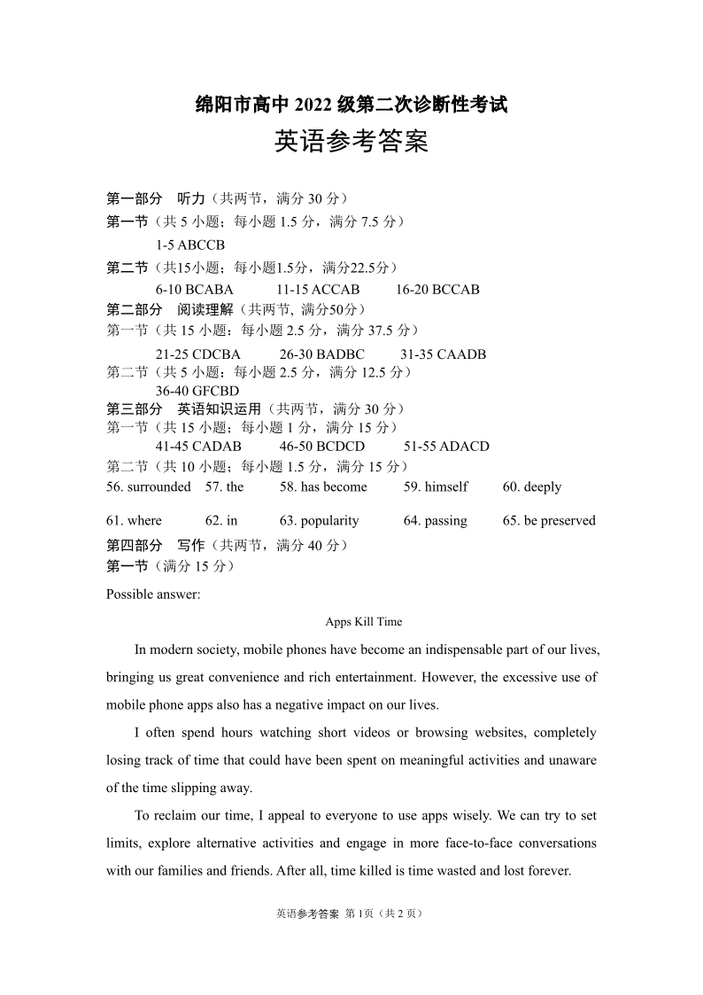 四川省绵阳市2024-2025学年上期高三第二次诊断性考试英语答案