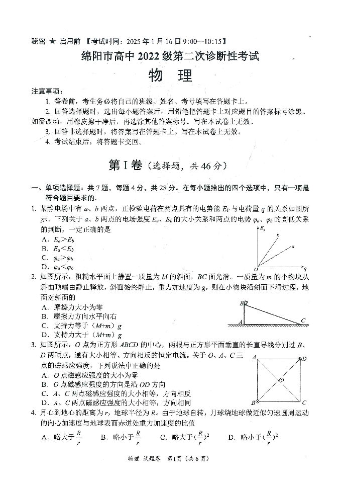 四川省绵阳市2024-2025学年上期高三第二次诊断性考试物理