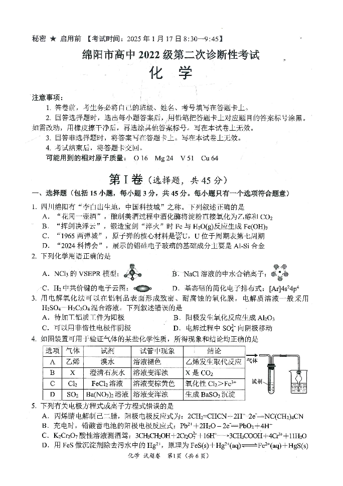 四川省绵阳市2024-2025学年上期高三第二次诊断性考试化学