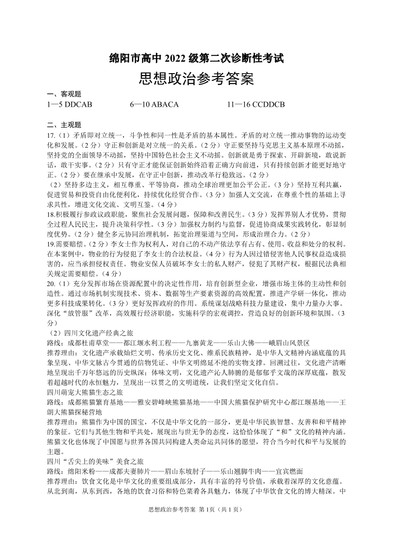 四川省绵阳市2024-2025学年上期高三第二次诊断性考试政治答案