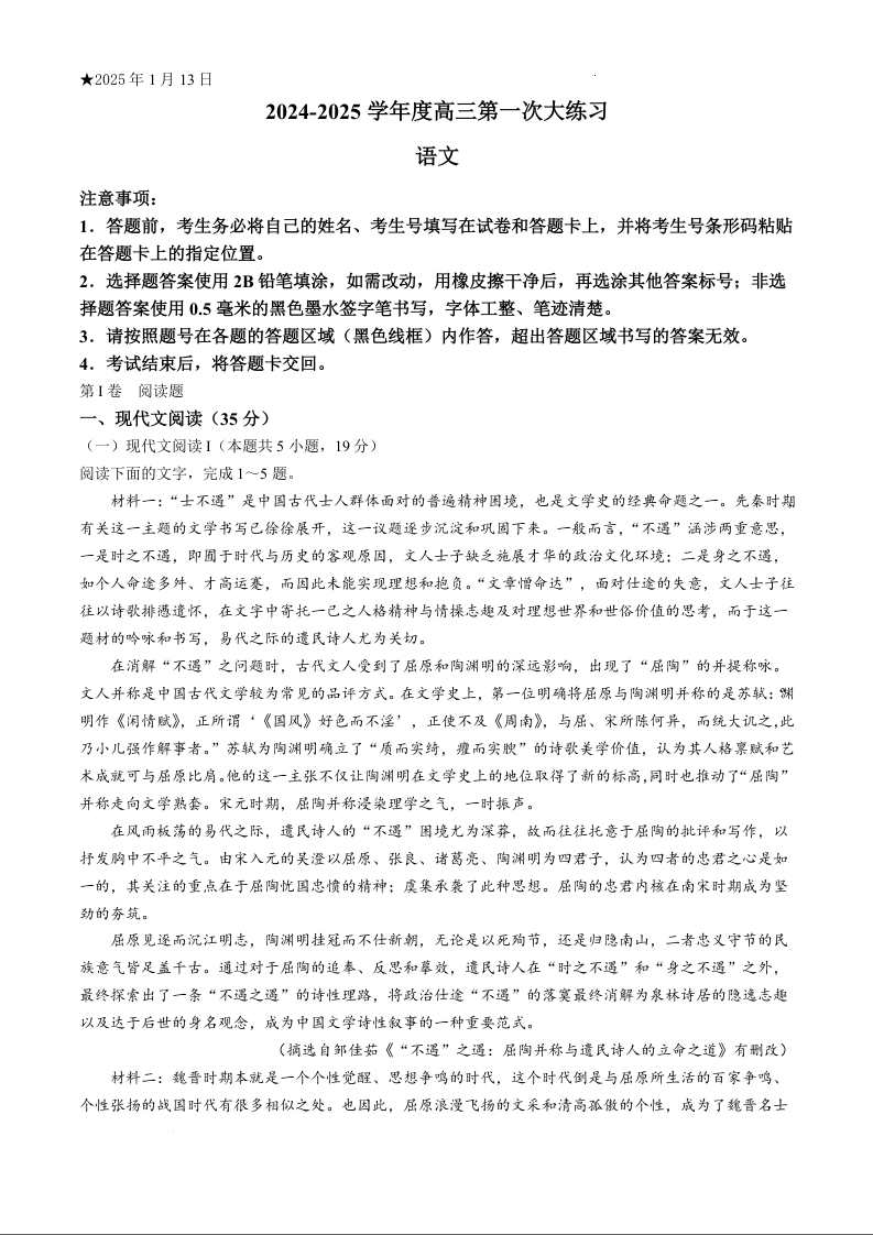 河南省三门峡市2024-2025学年上学期1月高三期末考试语文