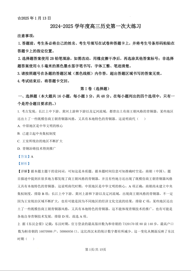 河南省三门峡市2024-2025学年上学期1月高三期末考试历史(精品解析版)