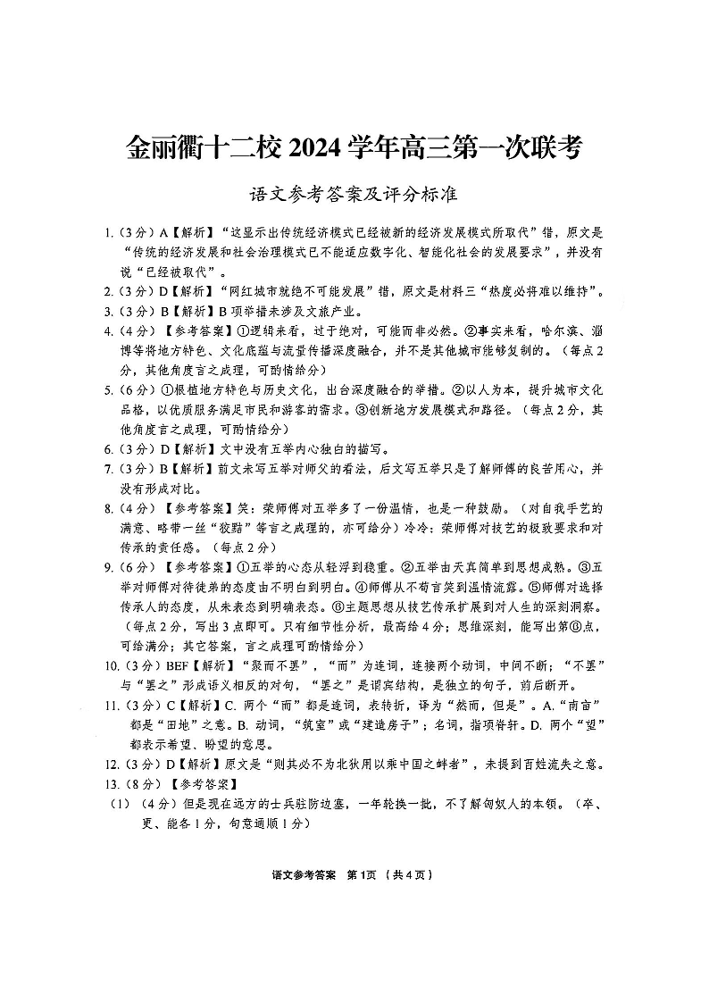 浙江省金丽衢十二校2024-2025学年上学期高三第一次联考语文答案