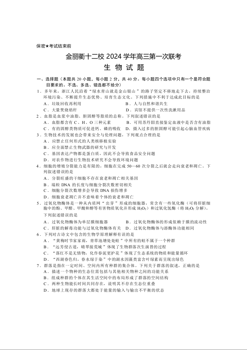 浙江省金丽衢十二校2024-2025学年上学期高三第一次联考生物