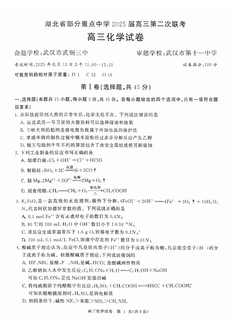 湖北省重点中学2024-2025学年上学期1月 高三第二次联考化学